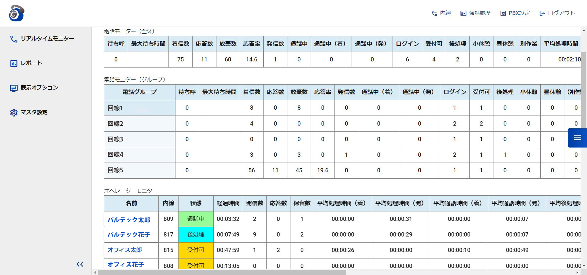 リアルタイムモニターでは、CS(顧客満足)に直結する待ち呼をリアルタイムで把握したり、コールセンター全体・チーム・オペレーター毎の統計情報や状態(受付可・通話中・後処理中など)の経過時間などをリアルタイムで簡単に把握することができます。